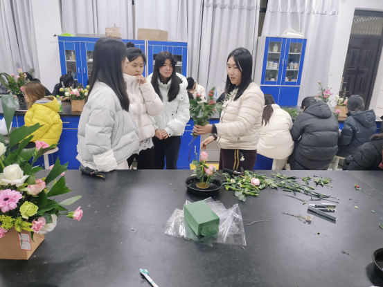 理论讲解结束,同学们迫不及待投入实践。修剪花枝、调整角度、固定花材…… 大家小心翼翼处理每一枝花材,娇艳的玫瑰、清雅的百合、清新的尤加利叶,在手中被赋予新的生命力。有人偏爱简约雅致的中式插花,追求 “疏影横斜水清浅” 的意境;有人钟情活泼明快的现代花艺,打造独具个性的作品。石娜老师穿梭其间,耐心指导细节,针对花材搭配不合理、构图失衡等问题及时给出修改建议。