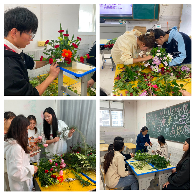 随后,同学们开始学习插花艺术,制作出的作品美轮美奂,形态各异,充满创意,展现出大家超强的学习和动手能力。