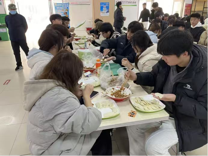 随着活动指令的下达,同学们迅速进入状态,原本整齐摆放着食材的餐桌瞬间变成了热闹的“创作现场”。食堂的空间里,面粉的清香与芹菜、猪肉等馅料的鲜香交织弥漫,勾勒出最动人的冬日校园图景。